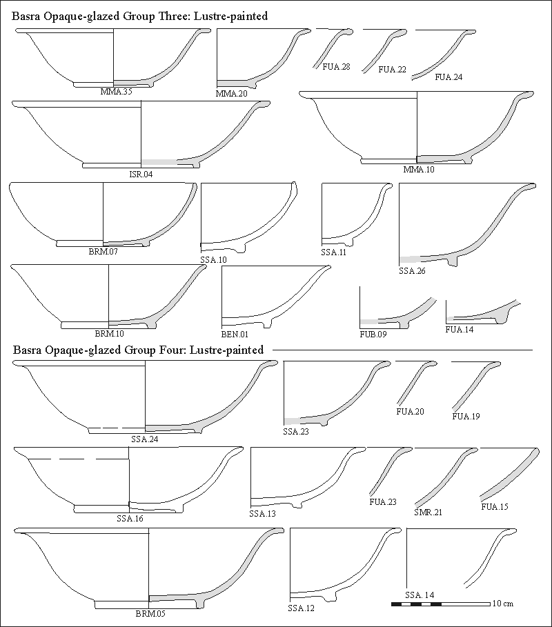 Figure 3.10. Form study for Basra Lustre-painted pottery Groups Three and Four (BEN.01 after Philon 1980; SSA.10-16 after Kervran 1977).