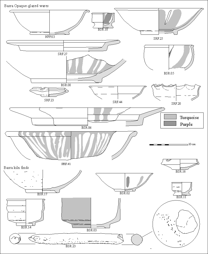 Figure 3.12. Selected examples of Opaque-glazed wares of Plain and Splashed types of Basra Petrofabric, with selected examples from Basra finds that do not have opaque glazes.