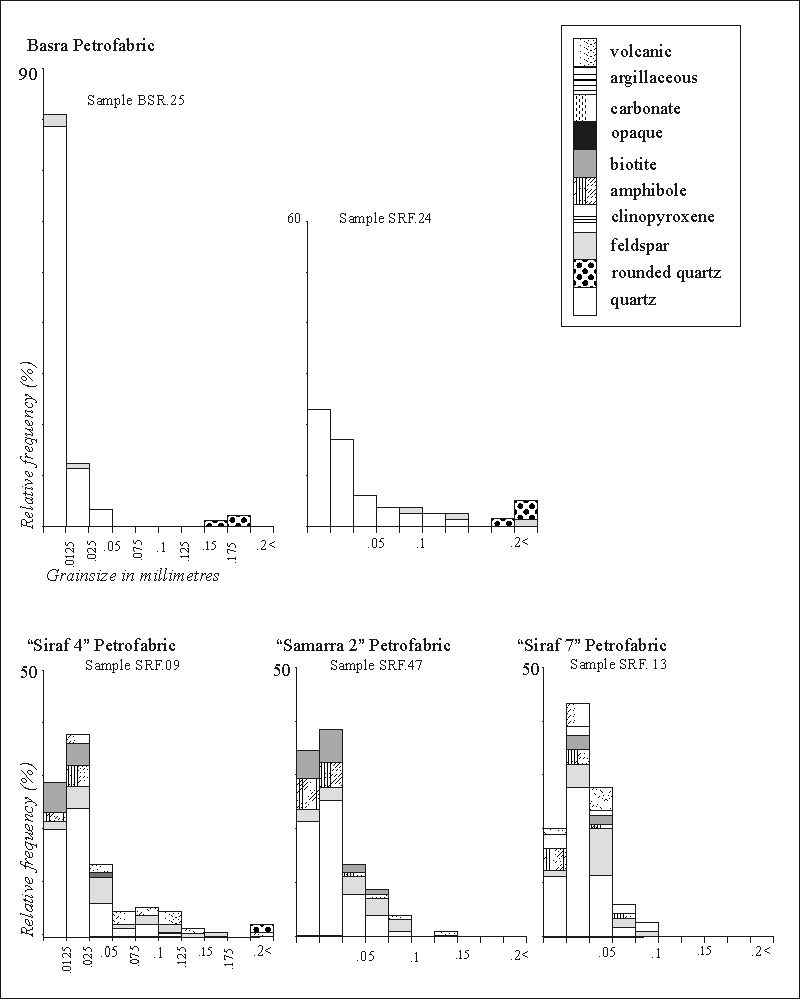 Figure 3.16. Grainsize-distribution histograms for selected Iraqi petrofabrics.