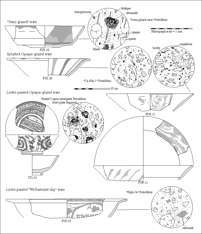 Figure 4.1. Selected pottery samples, with petrographic micrographs.