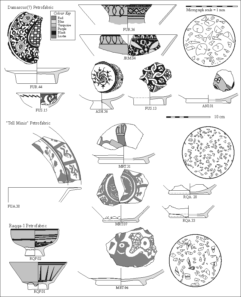 Figure 5.2. Selected Syrian Lustre-painted and Underglaze-painted wares of Damascus, ATell Minis,@ and Raqqa-1 Petrofabrics (FUA.38 is a sketch from photographs and may not be to scale).