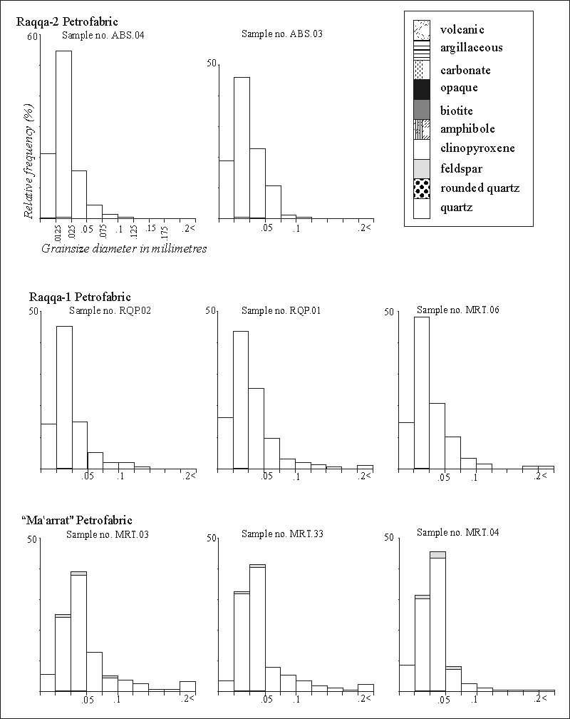 Figure 5.11. Grainsize-distribution histograms of selected samples of Raqqa-2, Raqqa-1, and "Ma'arrat" Petrofabrics.