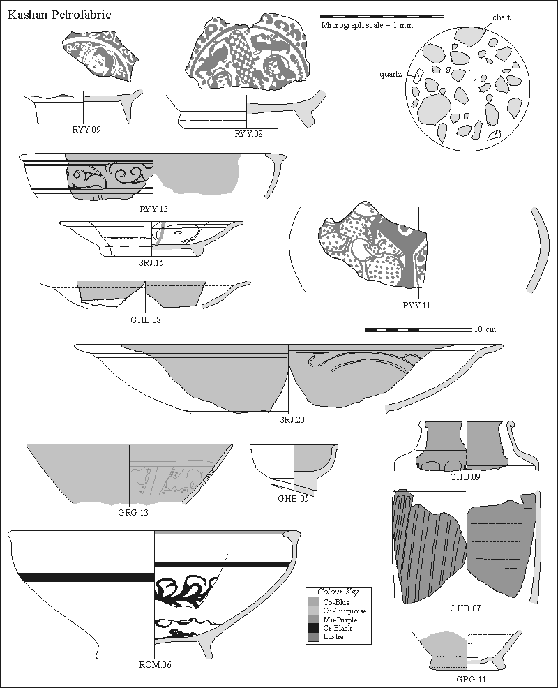 Figure 6.3. Selected Lustre-painted, Monochrome Incised, and Underglaze-painted wares, all of Kashan(?) Petrofabric.