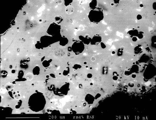 Plate 3.5. BSE image of Basra Lustre-painted ware (FUA.25), showing glaze (interface to body at bottom right) with inclusions of tin-oxide and wollastonite crystals.