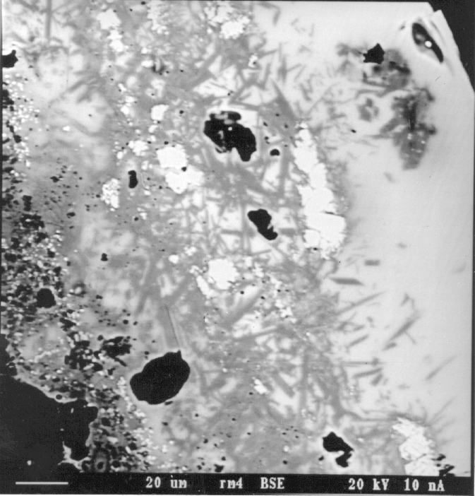 Plate 4.4. BSE image of Fustat Underglaze-painted ware (FUS.47) showing clay body to left ("High-Ca" Petrofabric), with wollastonite slip, magnesium-rich colourant grains (white) and lead-alkali glaze.