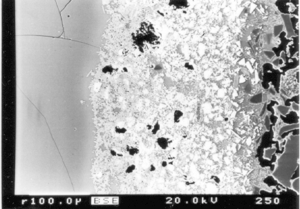 Plate 5.2. BSE image of Damascus polychrome Underglaze-painted wares (FUS.15), showing iron-rich red colourant (white grains) at interface between body (to right) and alkaline glaze (to left).