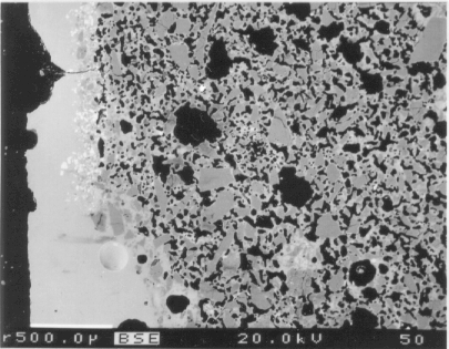 Plate 6.2. BSE image of "Silhouette" ware (ASH.57), showing detail of black slip consisting of quartz and chromium-rich grains, and alkaline glaze (interface with body to right).