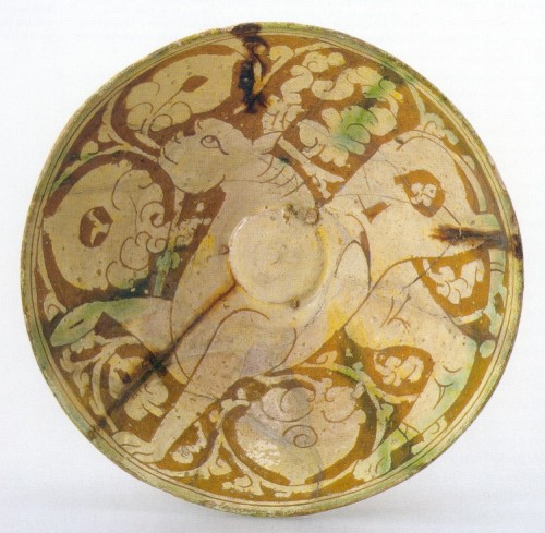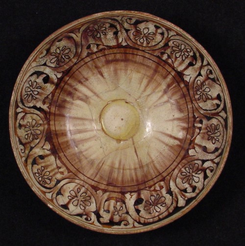 Plate C. Slip-excised or "Garrus" ware: red clay body, white overall slip, slip-excised decoration, probable manganese-rich black augmentation of excised areas, overall colourless lead glaze (ROM collection 924.39.2).
