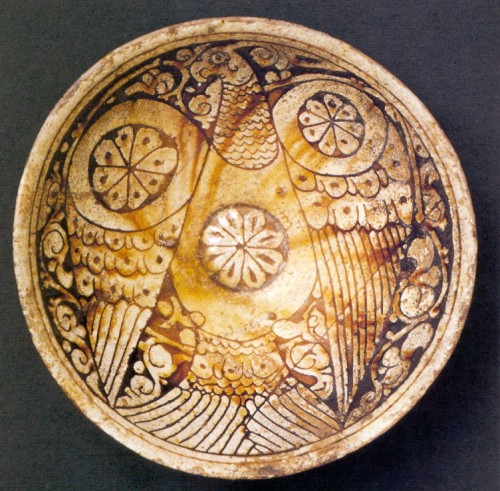 Plate A. Slip-excised or "Garrus" ware: red clay body, white overall slip, slip-excised decoration, manganese-purple and copper-green oxide splash-painting, overall colourless lead glaze (Grube 1994 pl 120, Khalili Collection, # POT704, diam 21.8 cm).