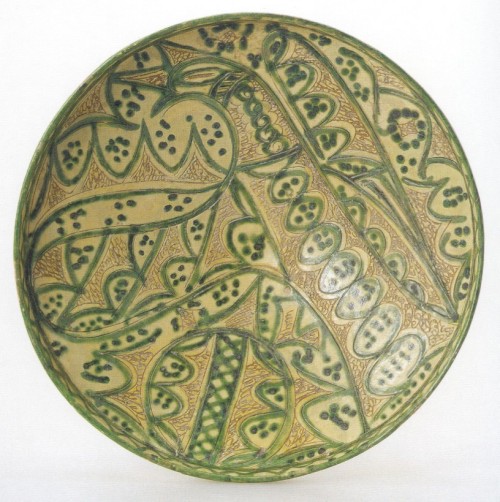 Plate A. Red clay body, overall white clay slip, decoration obtained by incision through the slip, copper-green pigment or slip-paint isolated between incised lines (diameter 31 cm). Note in particular the scribbled incised infill of the design (Grube 1994 pl. 127).