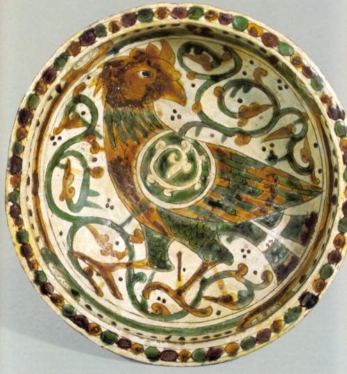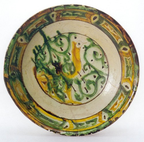 Plate A. Red clay body, overall white clay slip, decoration obtained by incision through the slip, copper-green and iron-yellow/brown pigment or slip-paint isolated between incised lines (diameter 35.5 cm). Note the similarities with early Iranian lustre-wares (Grube 1994 pl. 122).